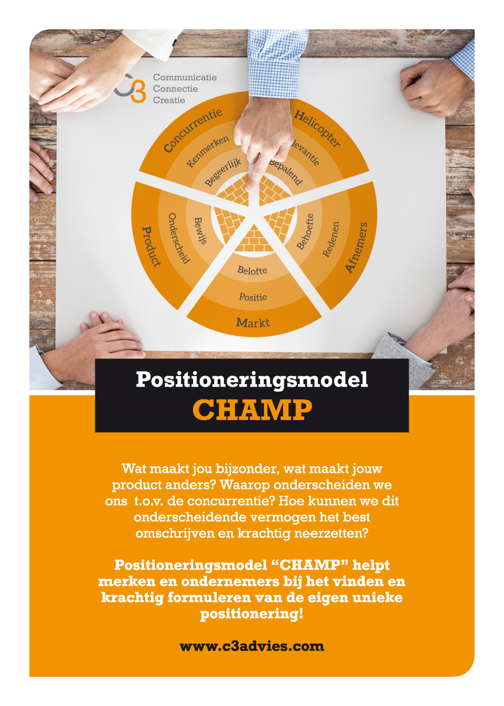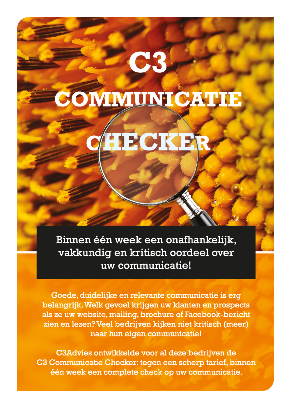 C3Advies helpt bedrijven zichzelf op de kaart te zetten: advies bij keuzes in marketing- en/of communicatiestrategie, in het vaststellen van de positionering en propositie. Communicatieopdrachten op strategisch niveau.